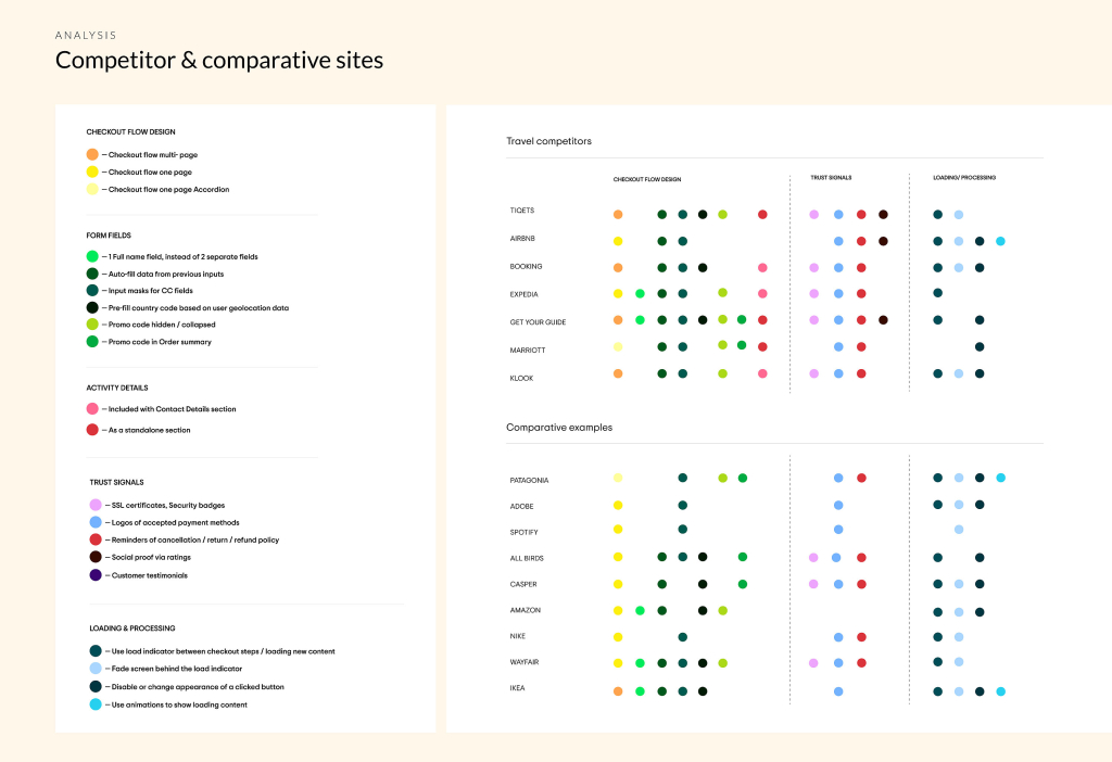 - Sample: 16 checkout experiences across direct competitors and best-in-class examples