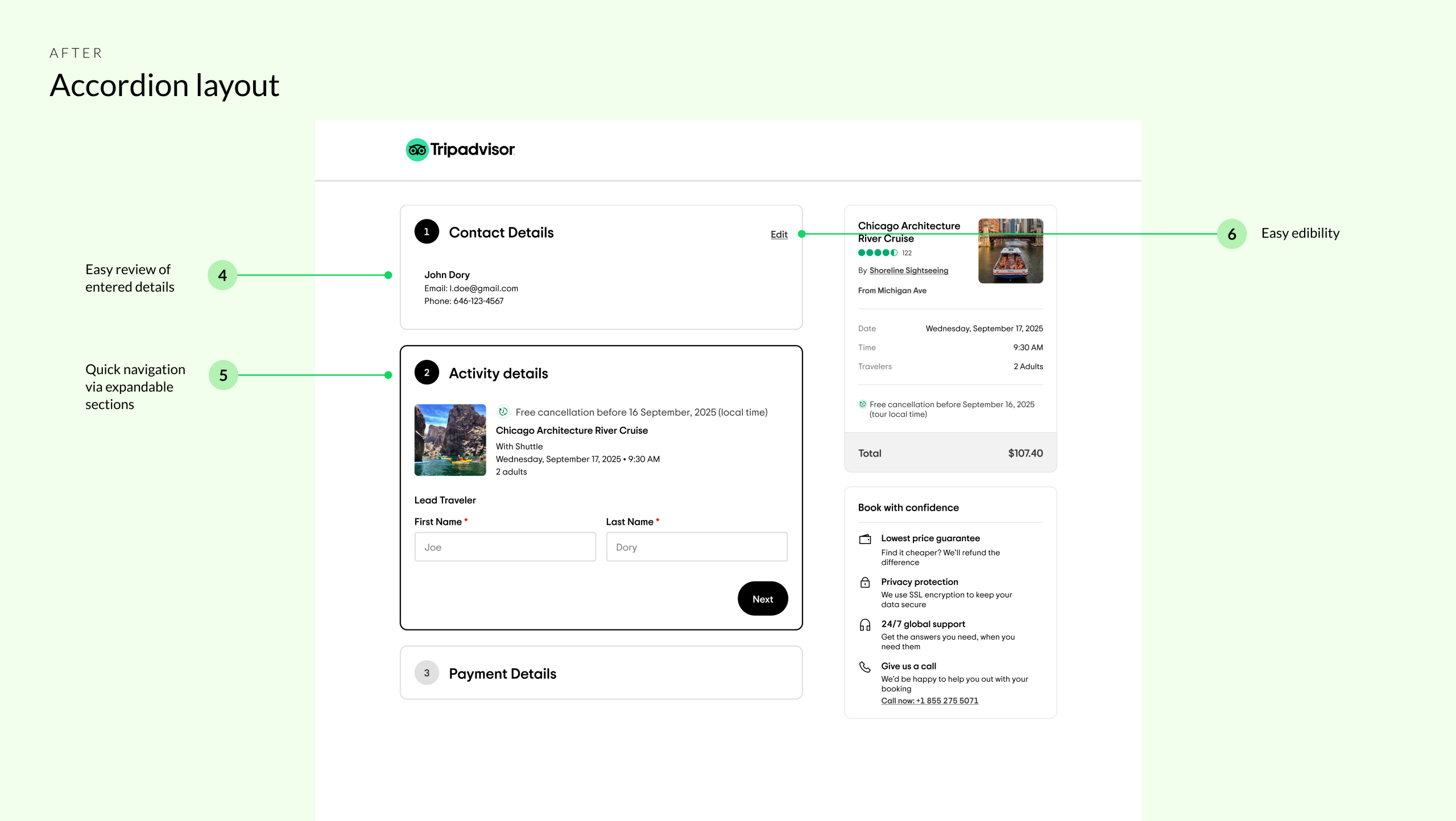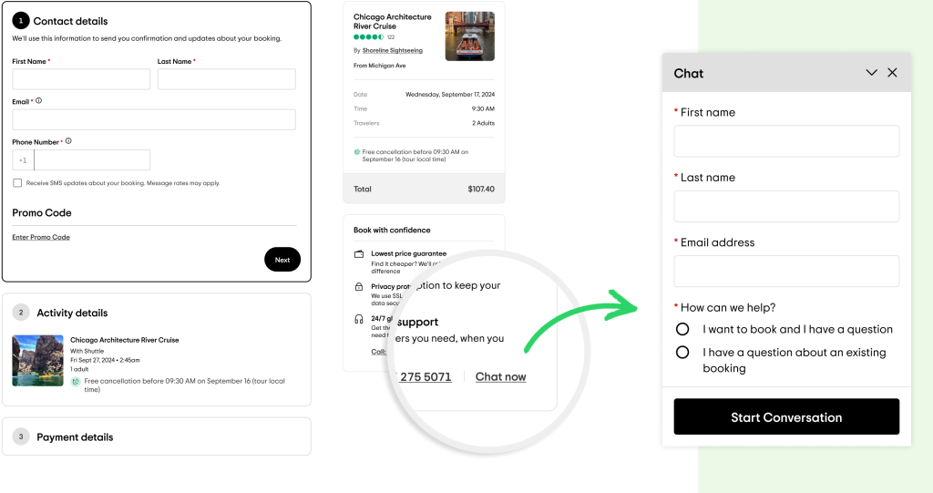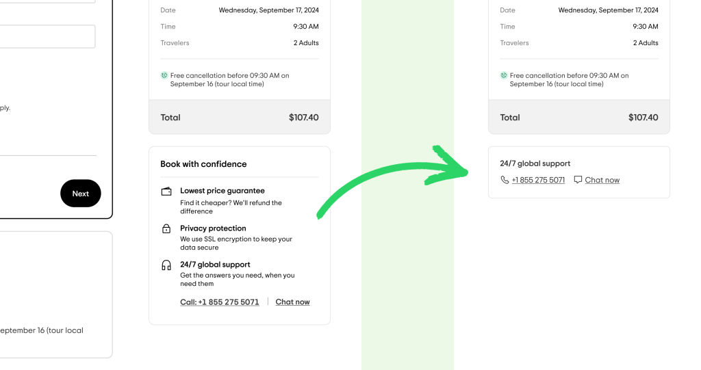 Users lacked confidence around booking details, often leaving checkout to seek clarification at high-intent moments.