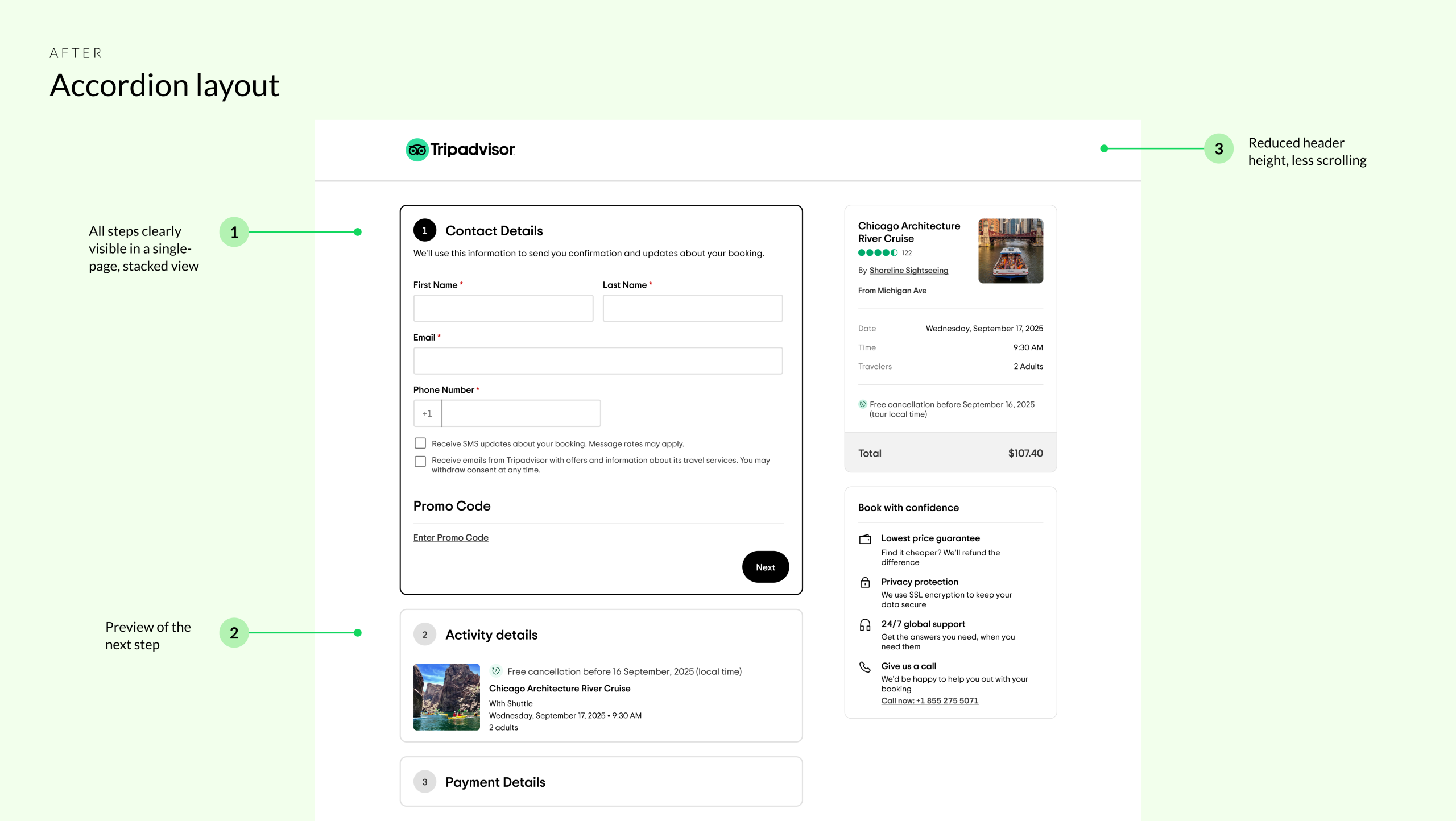 Collectively, these limitations reduced momentum and confidence at high-intent moments, leading us to explore a simpler, single-page accordion layout.