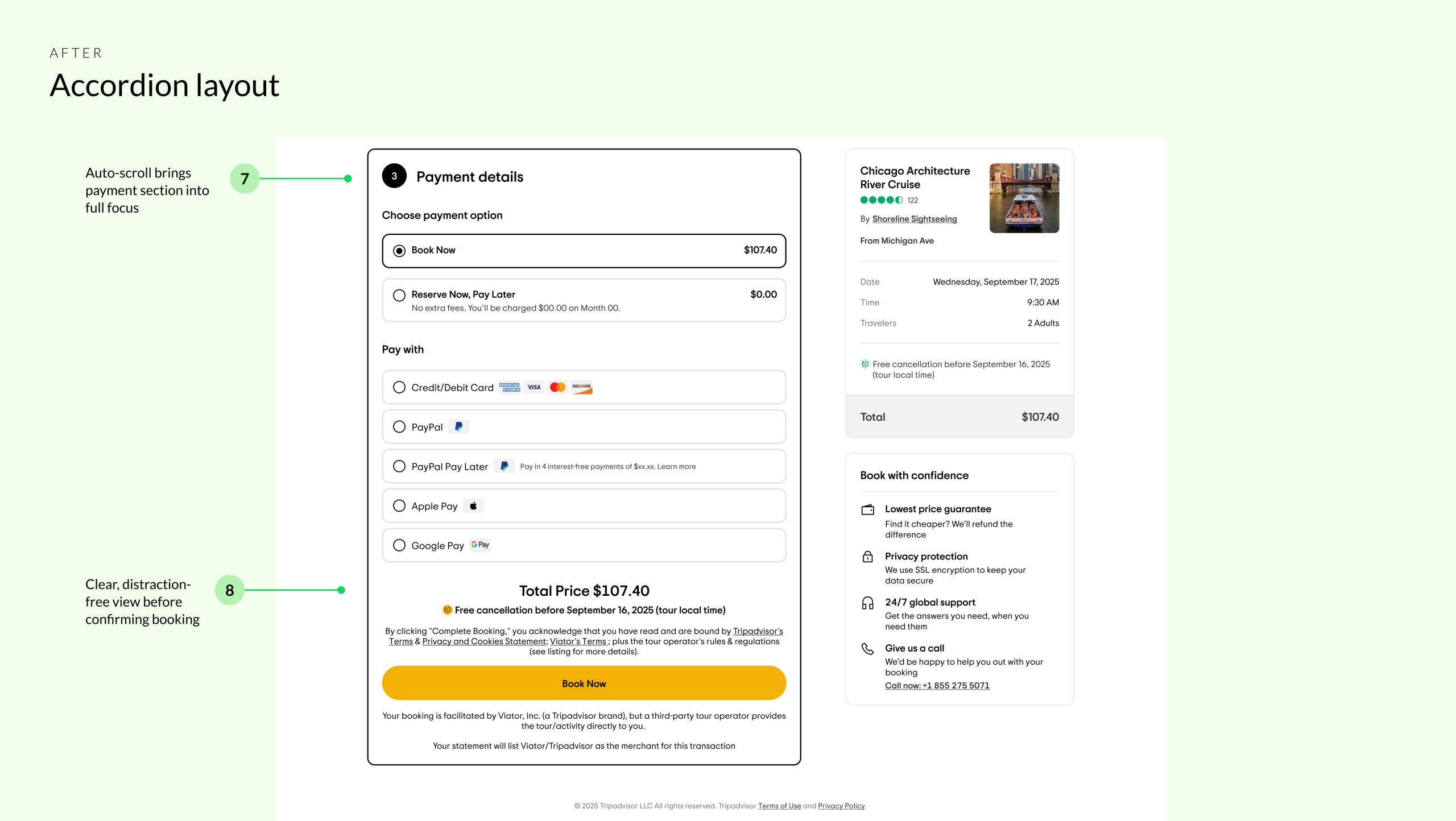 Preserve trust and clarity in high-intent, commitment-driven moments, particularly around payment and booking confirmation.