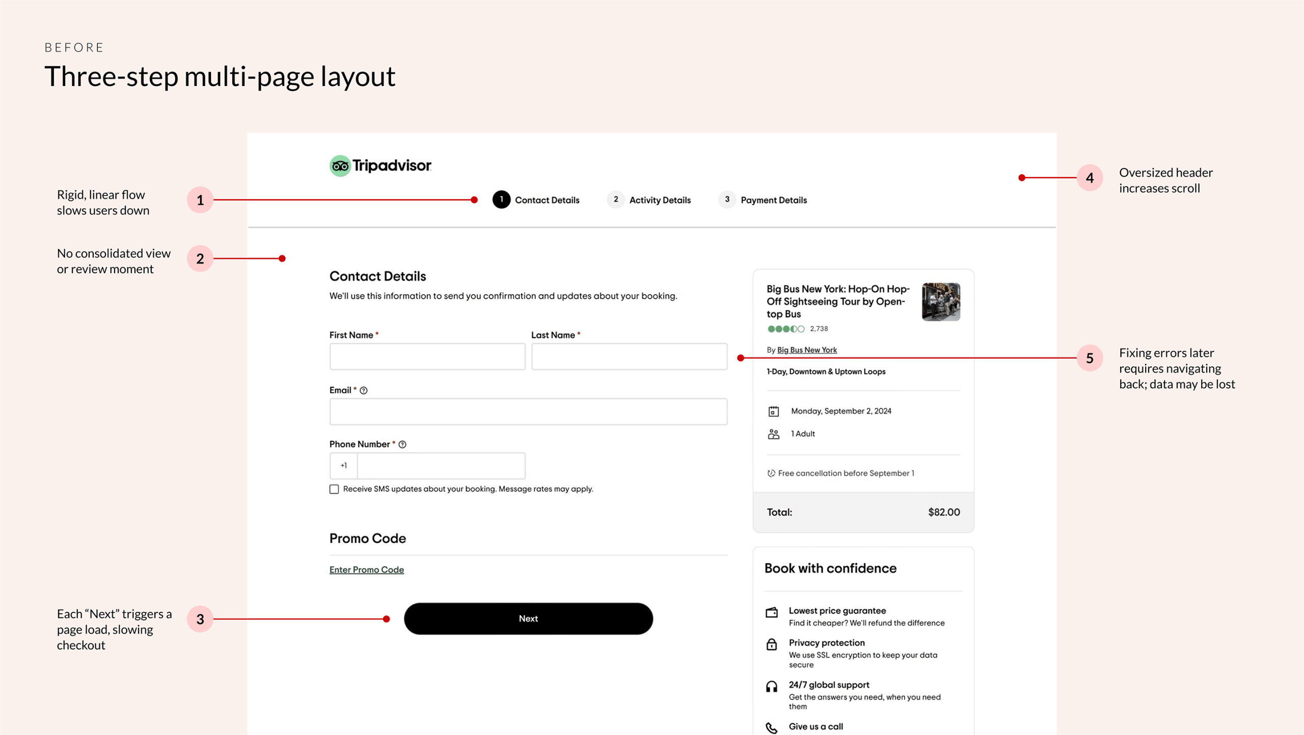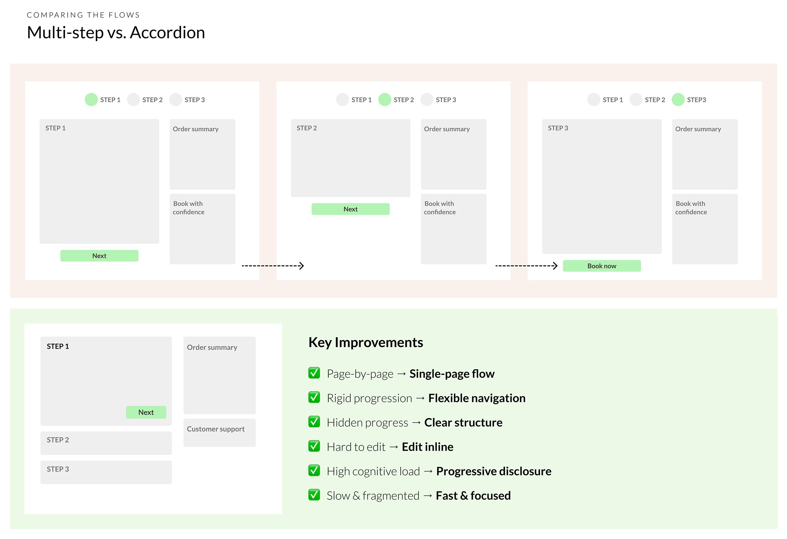 With this foundation in place, we revisited the existing three-step, multi-page checkout. While functional, the flow introduced unnecessary friction that made the experience feel more cumbersome than necessary.
