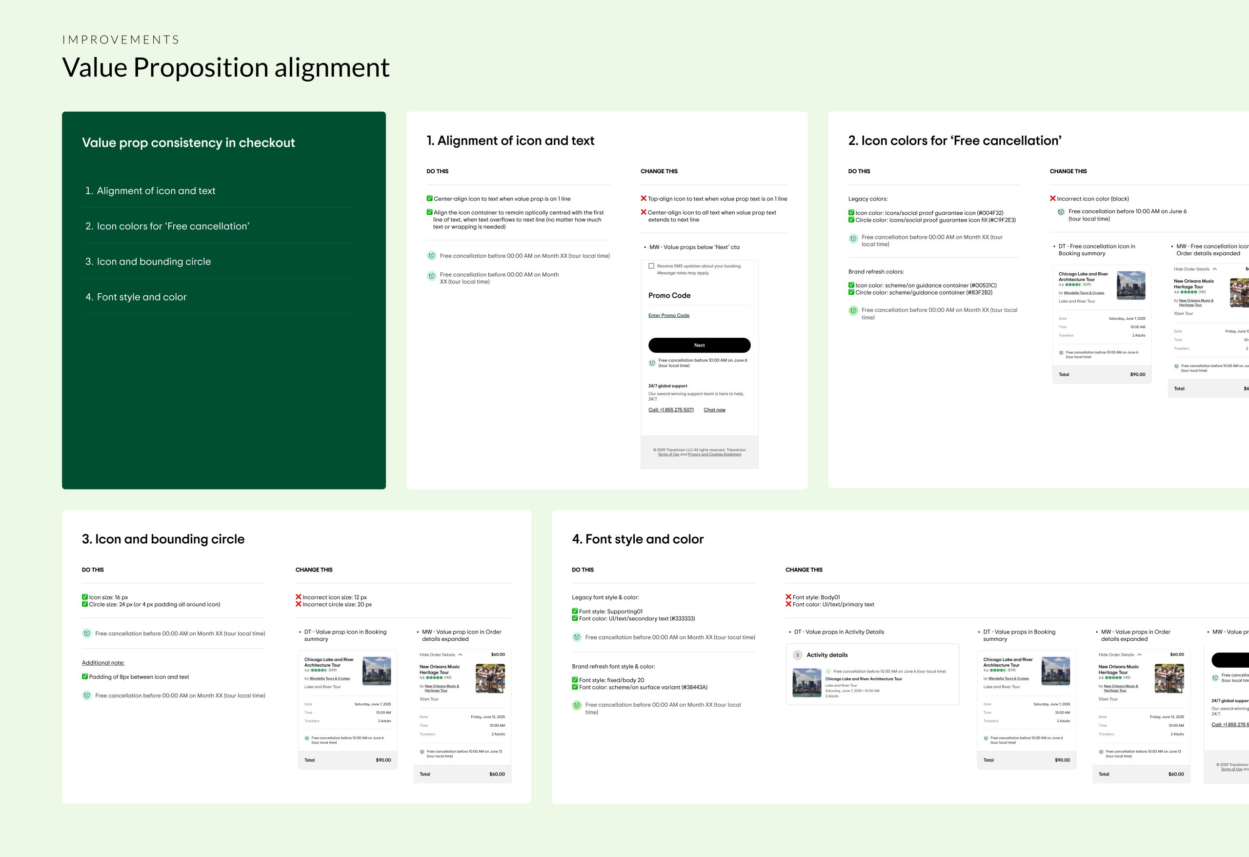 During this process, I identified inconsistencies in value proposition presentation and led efforts to standardise them, reinforcing visual consistency and trust across checkout. This work also surfaced broader patterns and opportunities to further improve the checkout experience.