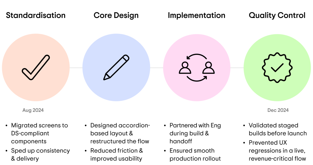 The checkout transformation began with a replatform to Design-System–compliant components. This established a more stable foundation for faster, lower-risk iteration and long-term scalability across a revenue and trust-critical payment flow.